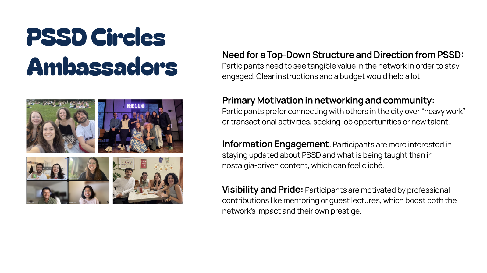 I led the organization of the “PSSD International Circles,” a global initiative that brought alumni and alumnae together through informal meet-ups in cities worldwide. Seeing its impact firsthand, I decided to expand the initiative further as the foundation of my thesis.
